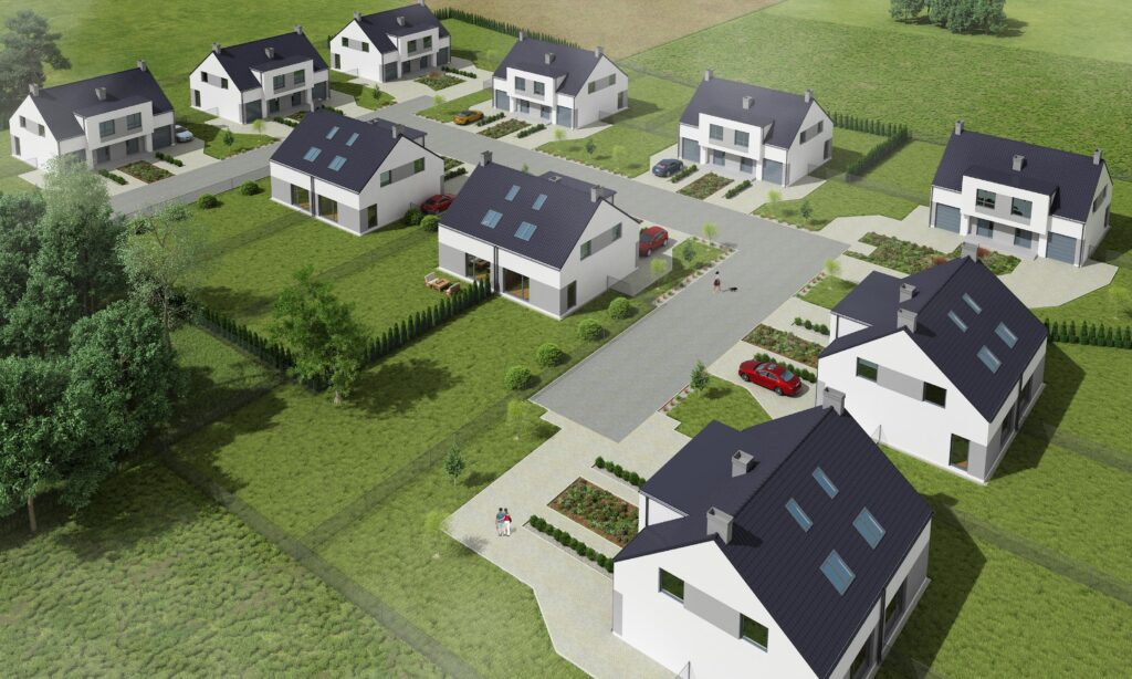 Nowoczesne domy w zabudowie bliźniaczej, zaprojektowane z myślą o rodzinach ceniących przestrzeń, funkcjonalność i spokój podmiejski. Każdy lokal posiada własny ogród, garaż jednostanowiskowy oraz taras.
